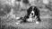 • Bernese Mountain Dog with a pear in his mouth lying on the grass in the garden