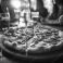 • Close up of a pepperoni pizza with mushrooms and basil on a wooden board with blurred background of people and drinks.