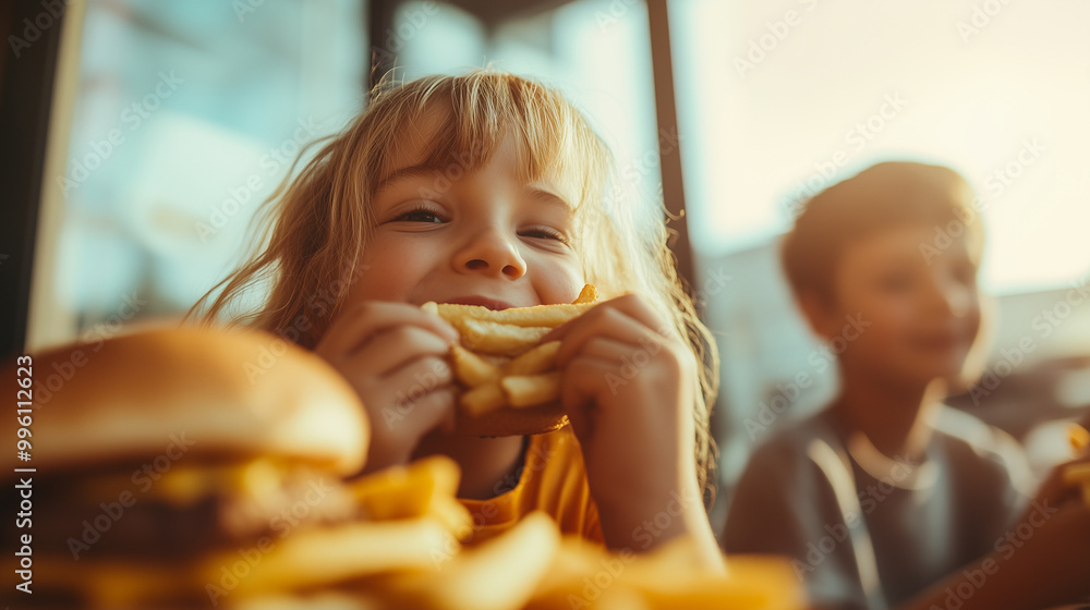 Fototapeta do Restauracji - A young girl is eating a burger and fries #996112623