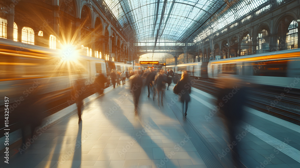 Fototapeta do Łazienki - A bustling train station with blurred travelers rushing past platforms. #1143254157