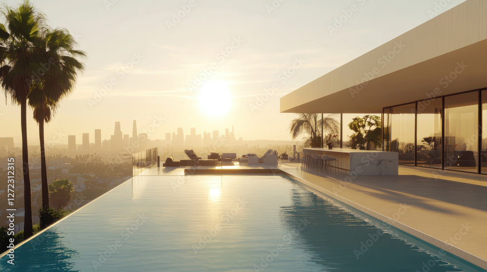 • Luxurious Hollywood villa features sleek design with an infinity pool. Stunning sunset casts a golden glow over the Los Angeles skyline, creating a serene atmosphere for relaxation