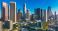 • Los Angeles city. LA downtown aerial view. Los Angeles skyline. LA streets. Los Angeles from a top view. Downtown towers of Los Angeles. Panoramic scene of LA skyline. Blue sky frames the city below.