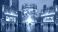 • Futuristic City Plaza with Dynamic Blue Digital Displays and Global Data Visualizations at Night