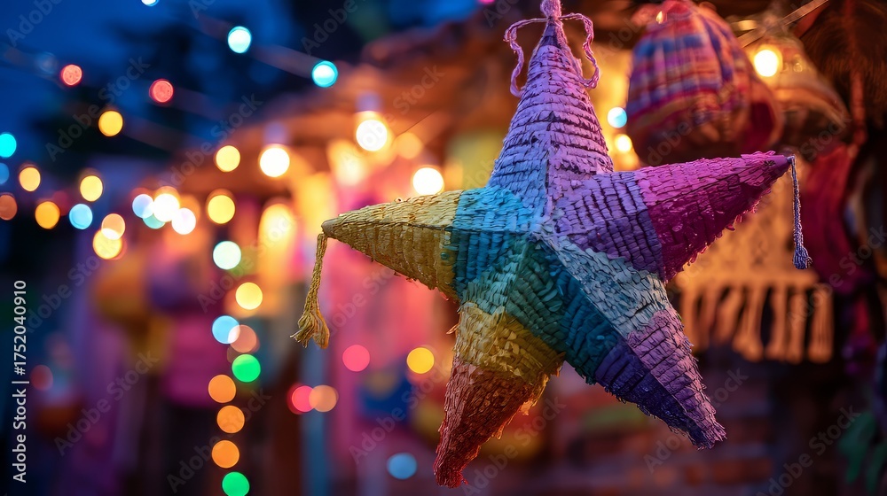 • Vibrant las posadas celebration decoration featuring a traditional star piñata hanging against a warm festive lights background, showcasing colorful hispanic holiday decor and joyful mexican christmas