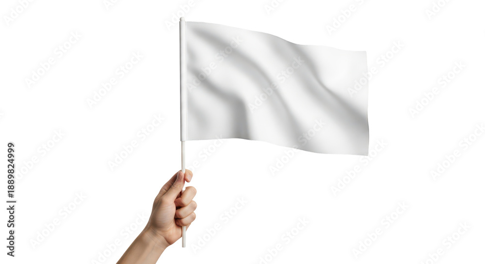 • Hand holding a small waving white blank flag for mockup. Isolated on transparent background, png
