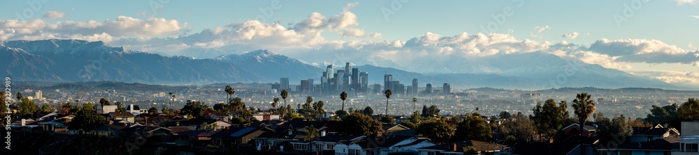 • Downtown Los Angeles and San Gabriel Mountains in Winter Panorama