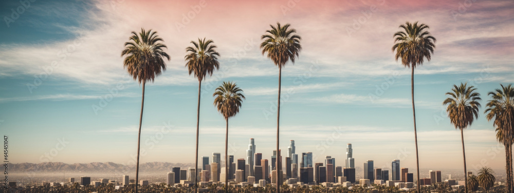 Fototapeta do Łazienki - Los Angeles skyline with palm trees in the foreground #645451047