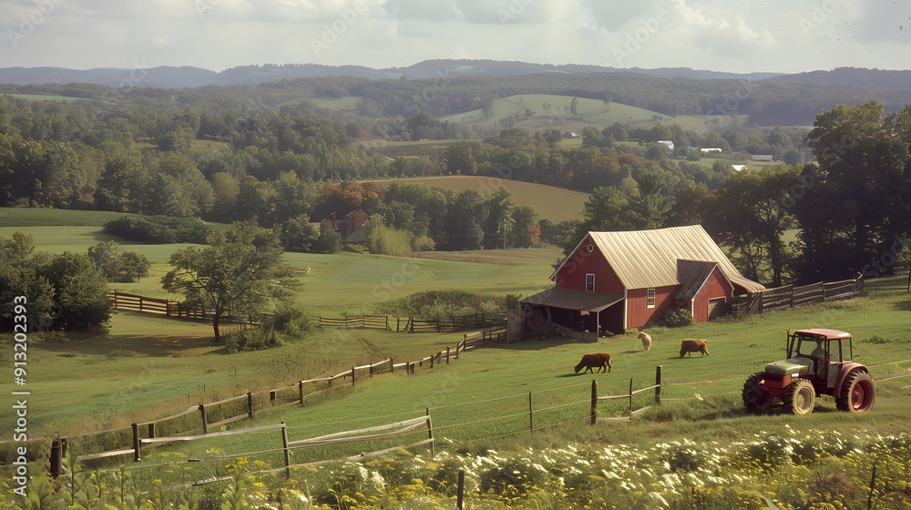 Fototapeta do Łazienki - A rural farm scene with a tractor barn and farmer tending to livestock in 1975. #913202393