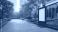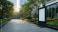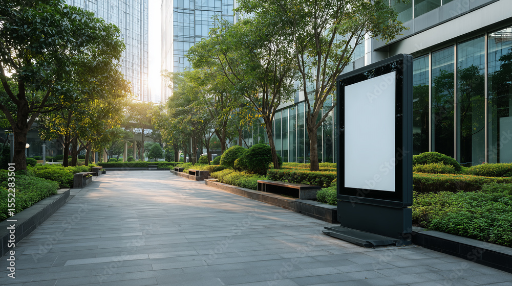 • Nowoczesna ścieżka piesza w otoczeniu zieleni i szklanych wieżowców, z widocznym pustym billboardem. Miejsce łączy naturę z miejskim krajobrazem.