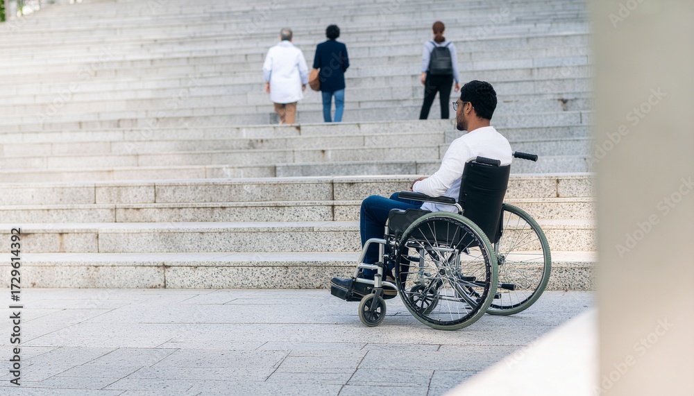 Fototapeta Architektura - Mężczyzna na wózku inwalidzkim przy wysokich schodach #1729614392