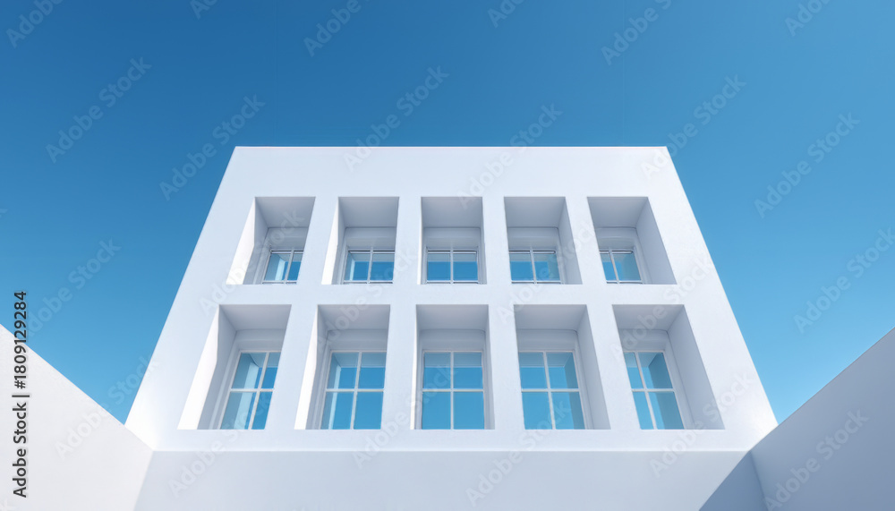 Fototapeta Architektura - Minimalistyczna biała architektura – śródziemnomorski styl w blasku słońca #1809129284