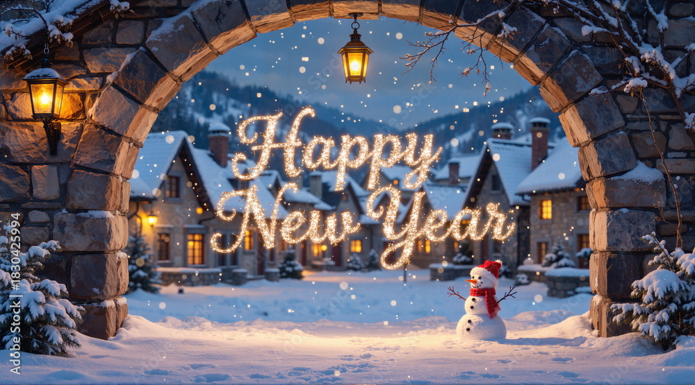 Fototapeta Architektura - HAPPY NEW YEAR. Happy New Year inscription. Festive atmosphere. Happy people. Warmest wishes. #1830425994