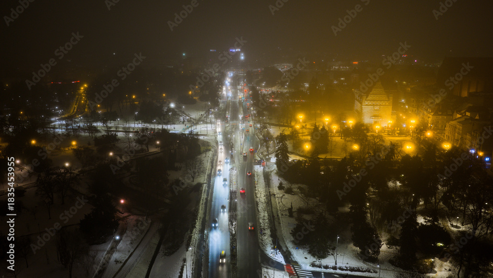Fototapeta Architektura - Widok z drona na nocne Stare Miasto w Toruniu, spowite delikatną mgłą. Podświetlone budynki i... #1835453955
