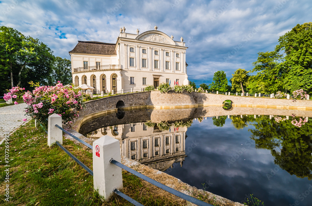 Fototapeta Architektura - Polska, Świętokrzyskie, Kurozwęki, Pałac z fosa z wodą, zieleń parkowa #707269923