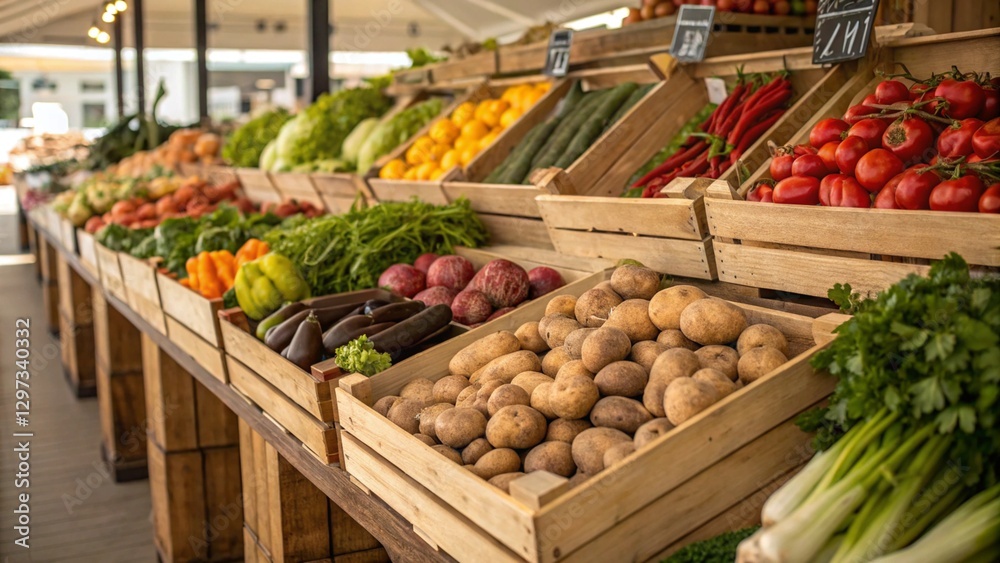 Fototapeta Jedzenie i Napoje - Vibrant fruit and vegetable stand at a local market. Wooden boxes overflowing with ripe and... #1297340332