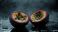 Fototapeta Jedzenie i Napoje - Passion fruit cut open on a dark, moody background #1414273438