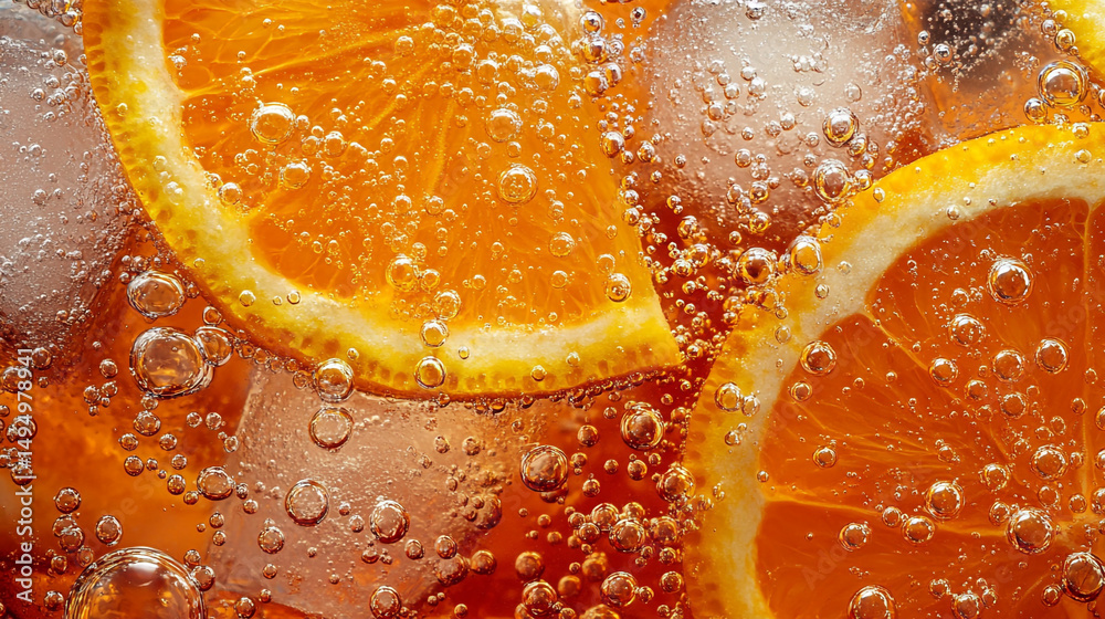 • Sparkling Orange Slices in Iced Drink Refreshing Summer Beverage
