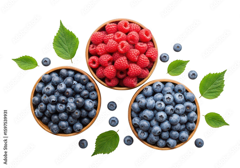 • Three wooden bowls filled with fresh raspberries and blueberries with green leaves fruit raspberry