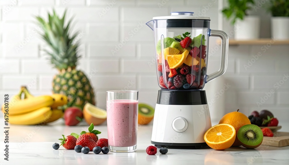 Fototapeta Jedzenie i Napoje - A blender loaded with assorted fruits next to a fresh fruit smoothie glass. #1675630783