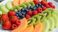 • Colorful fruit platter with assorted berries, melon and kiwi on a white plate, bright daylight.