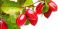 • Vibrant red miracle fruit on a branch with green leaves against a white background.