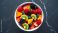 • Vibrant fresh fruit salad in a white bowl top down view healthy food photography delicious refreshing meal