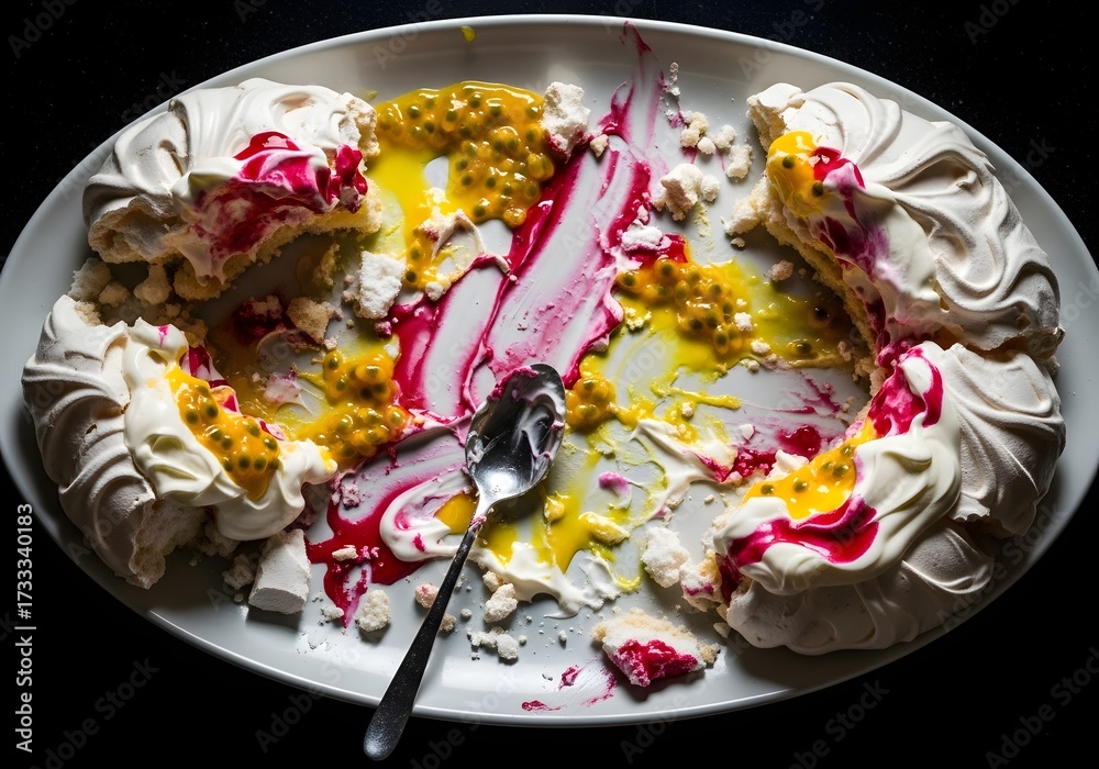 Fototapeta Jedzenie i Napoje - Messy Pavlova with Passion Fruit, Berry Sauce, and Spoon #1733340183