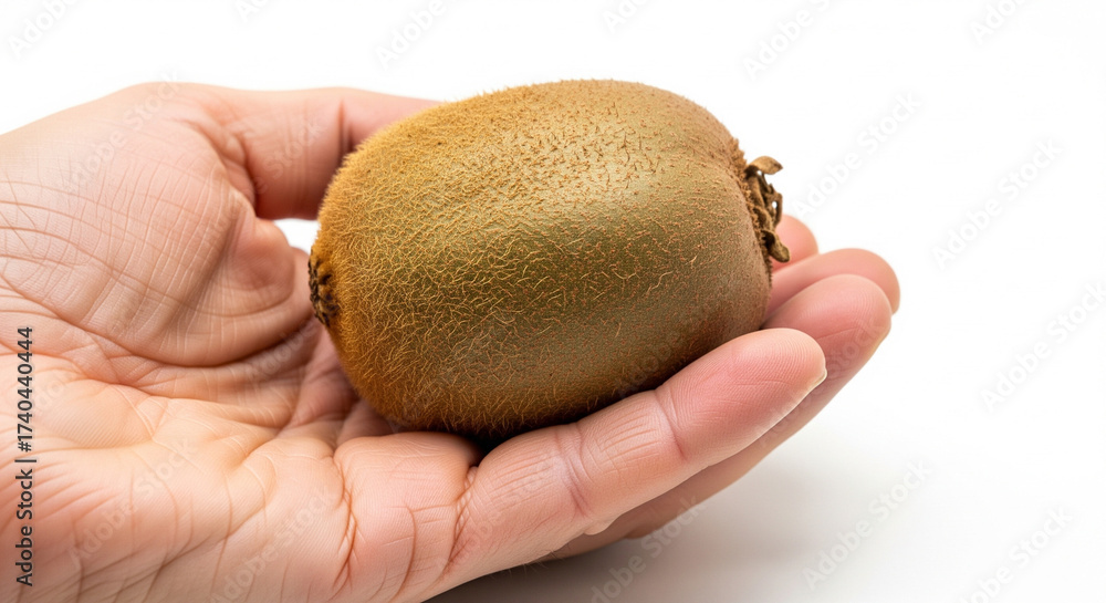 Fototapeta Jedzenie i Napoje - Fresh kiwi fruit held in hand with plain white background, tropical healthy food concept. #1740440444