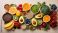 • overhead shot of various healthy foods including fruits and vegetables laid out