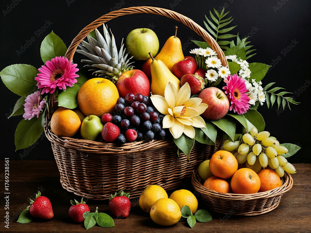 • Beautiful fruit basket overflowing with fresh produce and flowers