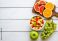 Fototapeta Jedzenie i Napoje - Fresh fruit assortment displayed on a white wooden surface #1793712127