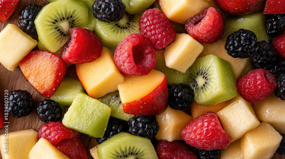 • Fresh mixed fruit salad with kiwi, raspberry, blackberry, melon and strawberry pieces