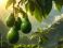 • Close-up of ripe green fruit hanging from branches, sunlight beaming down