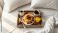 • A delicious breakfast spread on a wooden tray in bed with pancakes and fresh fruit
