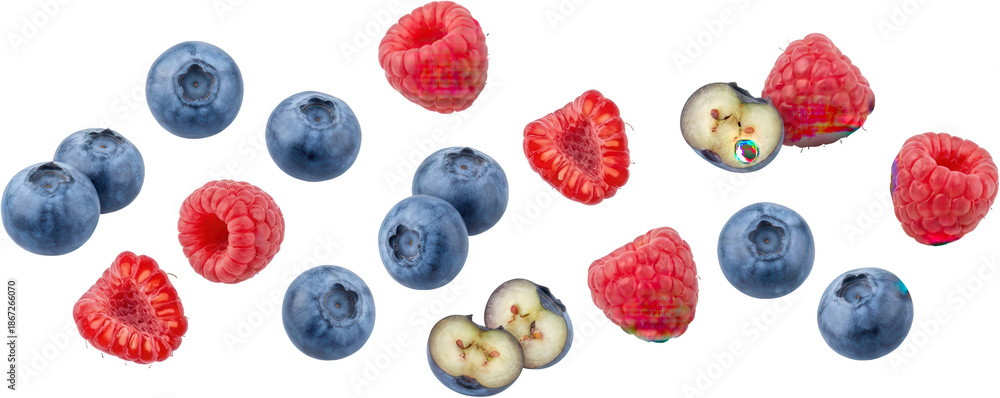 • Assortment of fresh ripe blueberries and vibrant raspberries some whole and some halved scattered in a random pattern blueberry raspberry berry fruit healthy natural sweet transparent background