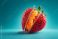 • Strawberry zipper orange surreal creative fruit studio minimal vibrant concept. surreal studio image of strawberry unzipped to reveal orange segments inside blending creativity and vibrant color