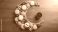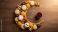 • Crescent moon shape filled with assorted dried fruits, nuts, and cookies on a wooden background