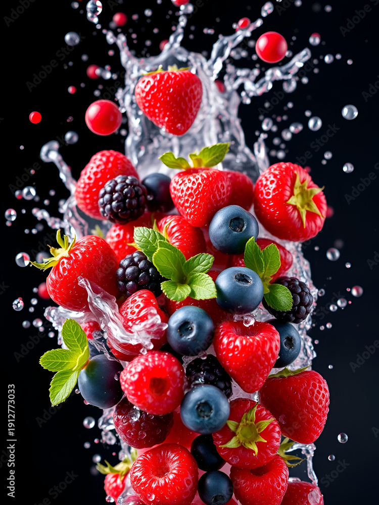 • Vibrant mixed berries in splash, a delightful and refreshing display of freshness