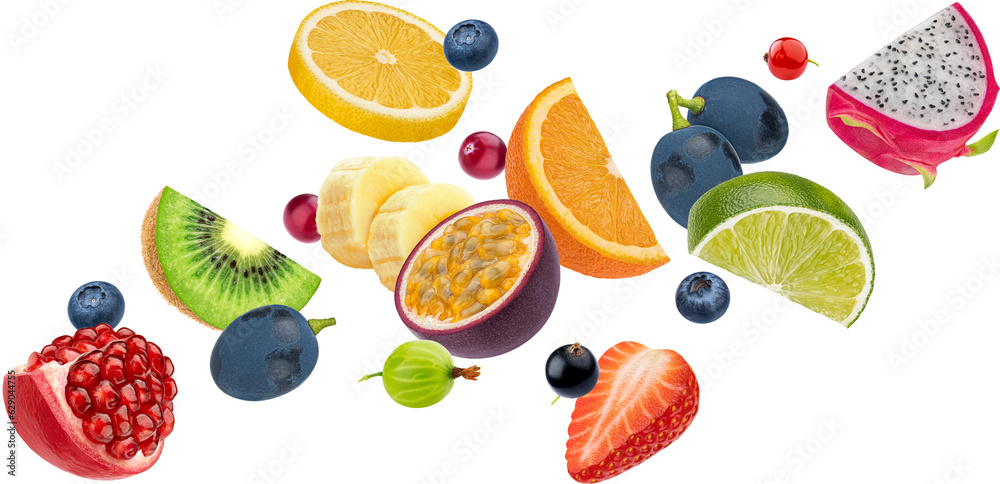 • Fruit salad ingredients, falling exotic fruit slices and berries collection isolated