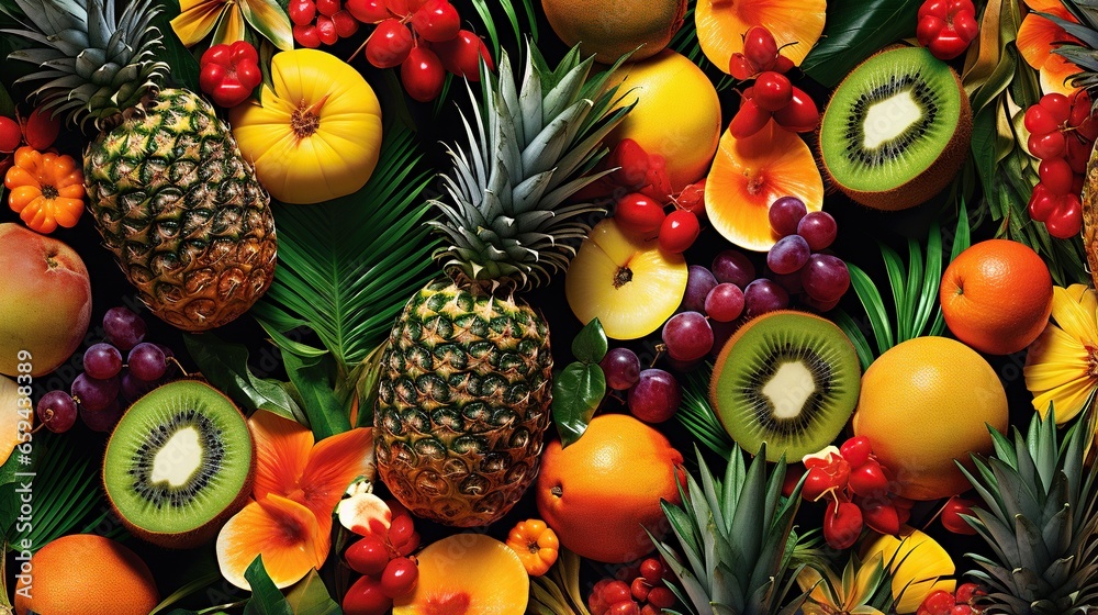 Fototapeta Jedzenie i Napoje - a bunch of fruit is shown with pineapples, oranges, kiwis, grapes, and kiwis. generative ai #659438389