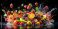• Water Splashing on a Mix of Berries and Citrus Fruit, black background, photography, fresh fruits, healthy food, water splash, fruit salad