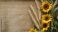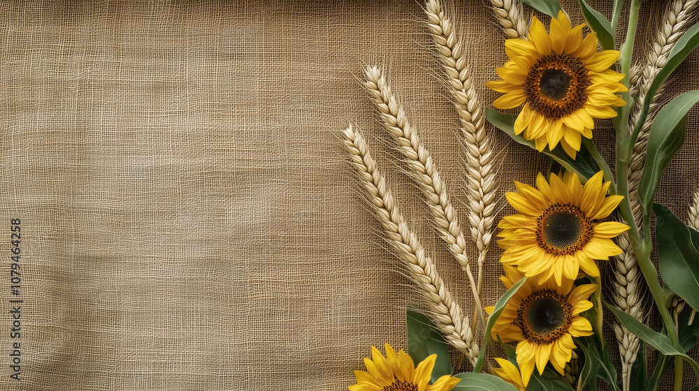 Fototapeta Kwiaty - Ułożone na jutowym tle słoneczniki i kłosy pszenicy wprowadzają naturalny, rustykalny styl. #1079464258