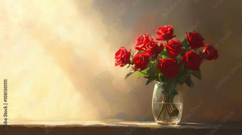 Fototapeta Kwiaty - Szklany wazon z bukietem żywych czerwonych róż, oświetlony łagodnym słońcem, emanuje zaproszeniem... #1081301111