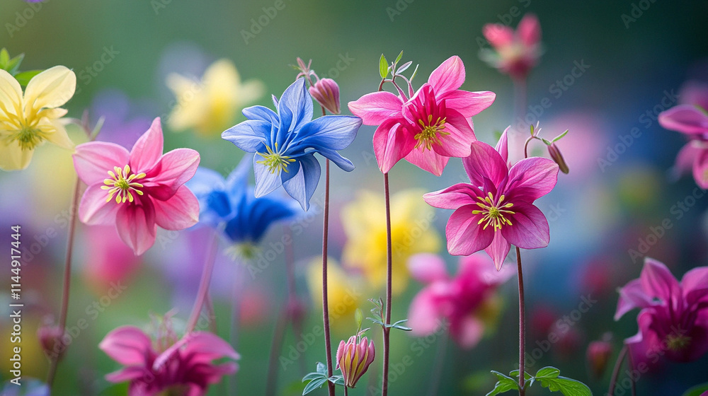 Fototapeta Kwiaty - Piękne kolorowe orliki, wiosenne kwiatowe tło, generative ai #1144917444