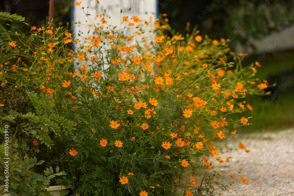 Fototapeta Kwiaty - Pomarańczowe, letnie kwiaty ogrodowe, kosmos pierzasty, tło, tapeta #1159639910