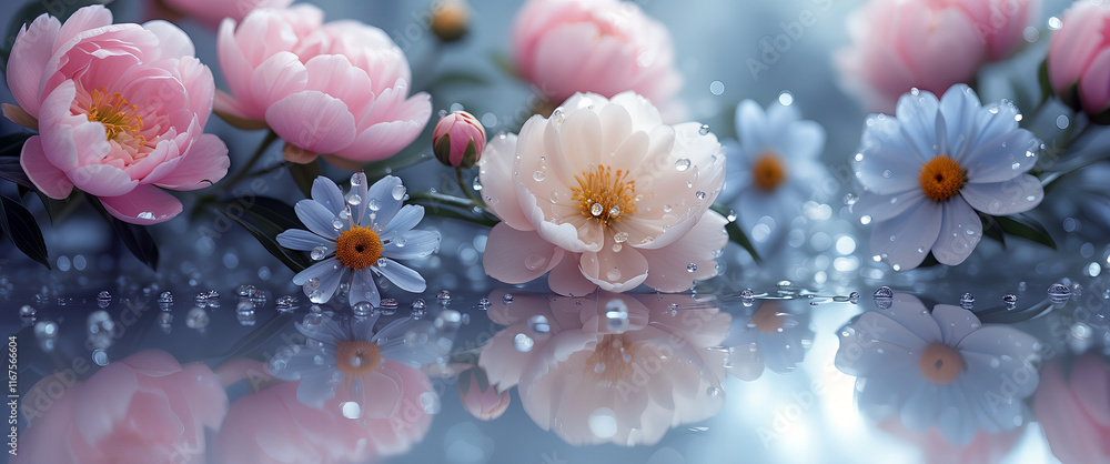• Różowe róże i niebieskie kwiaty polne z kroplami wody