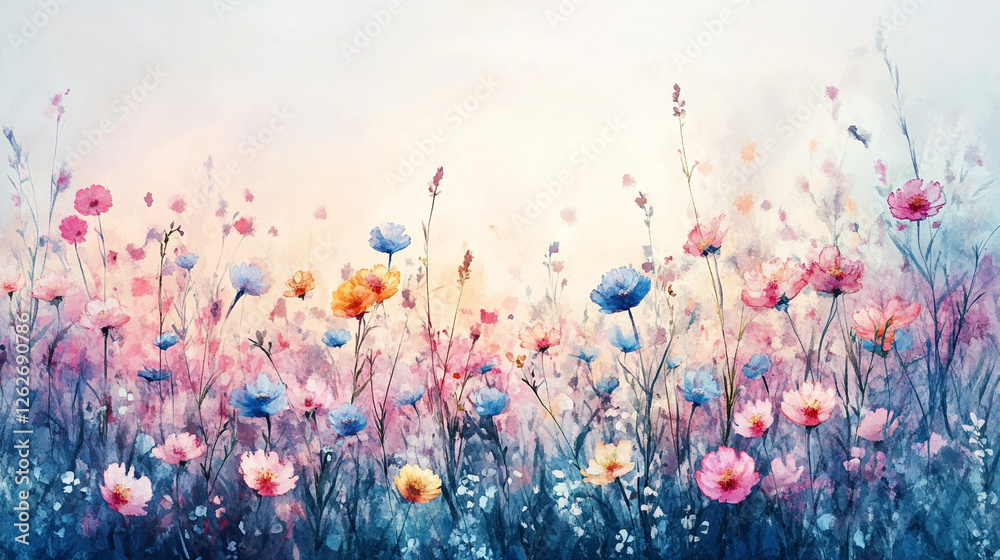 Fototapeta Kwiaty - Kolorowe kwiaty na łące, akwarelowe tło generative ai #1262690786
