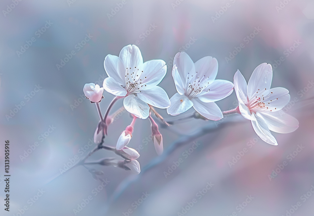 Fototapeta Kwiaty - Delikatne kwiaty wiśni na pastelowym tle – romantyczna kompozycja wiosenna z miękkim światłem i... #1313905916