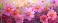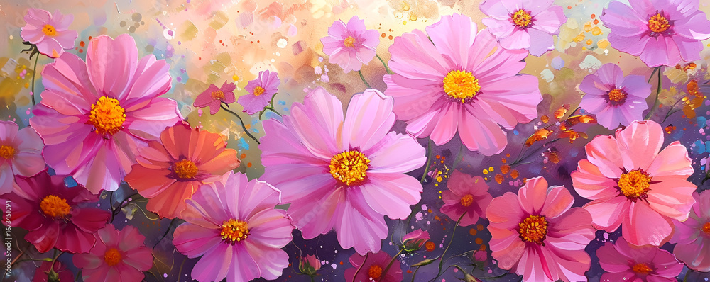 • Artystyczny, impresjonistyczny obraz przedstawiający łąkę pełną kolorowych kwiatów kosmosu. Radosne, letnie tło idealne jako baner.