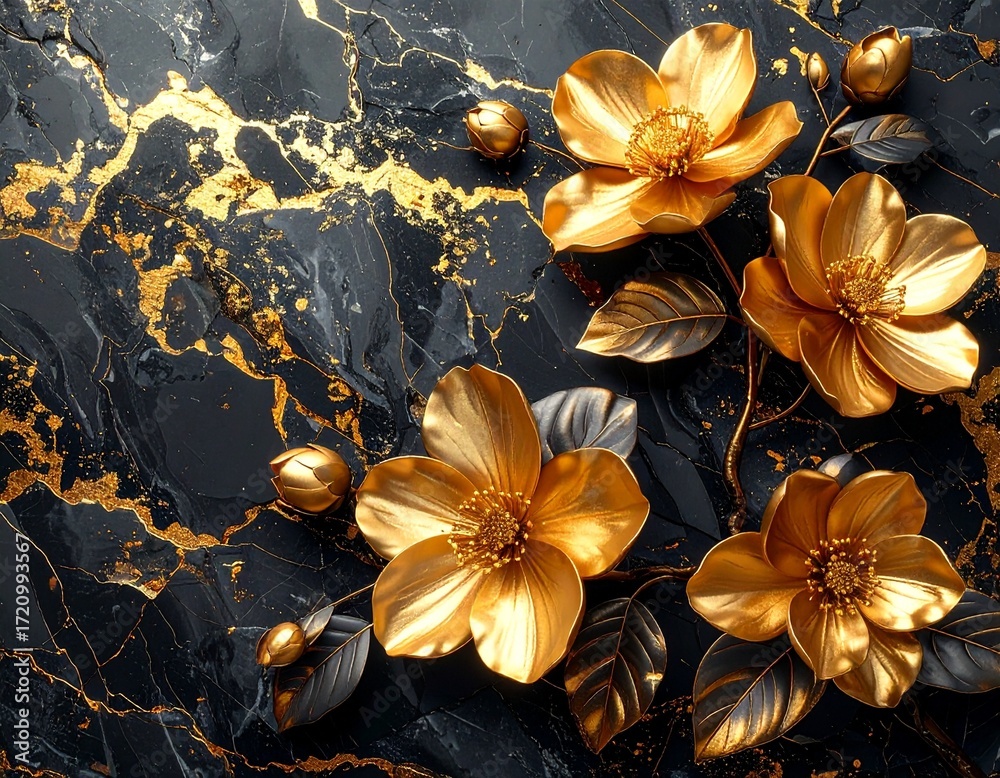 Fototapeta Kwiaty - Złote kwiaty na czarnym, marmurowym tle ze złotymi pęknięciami #1720993567
